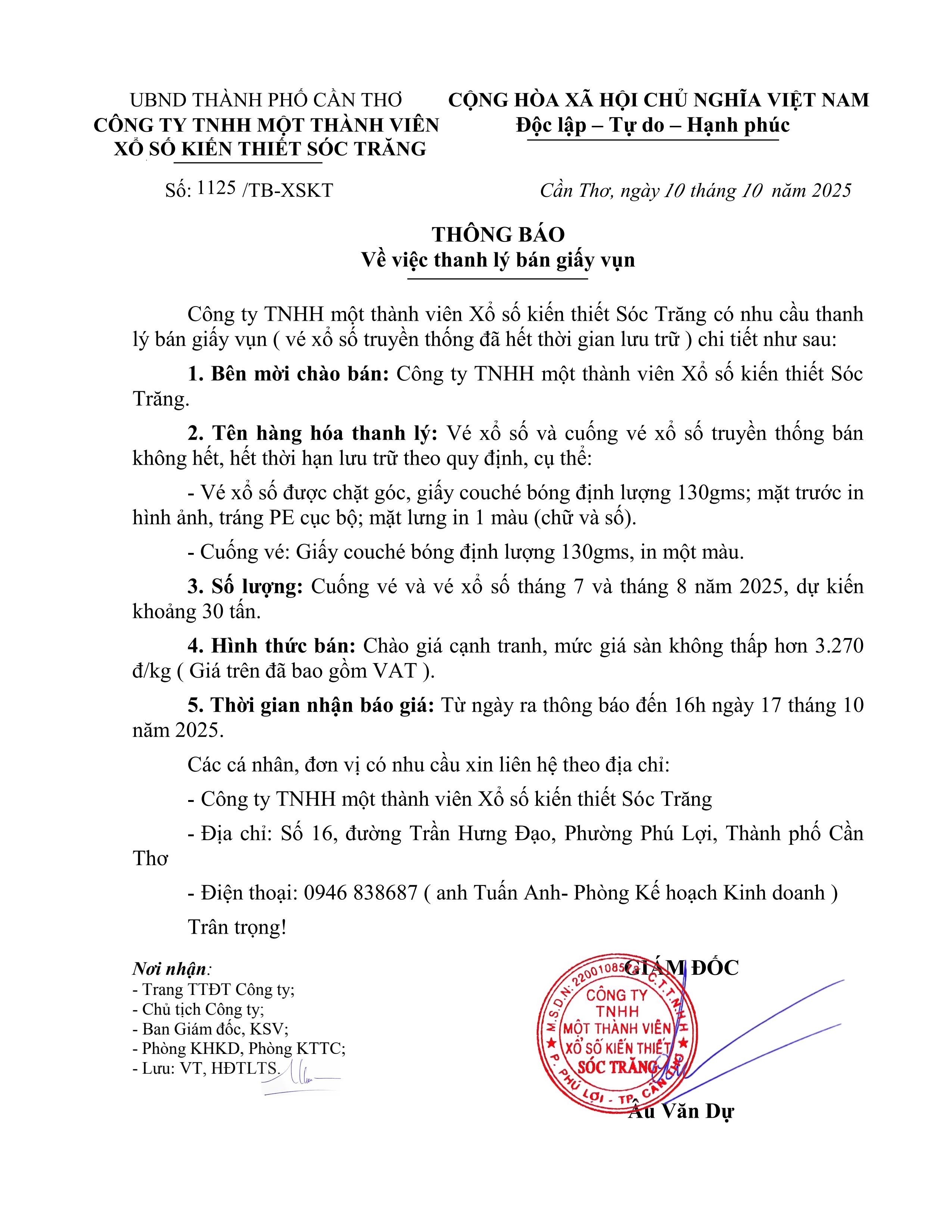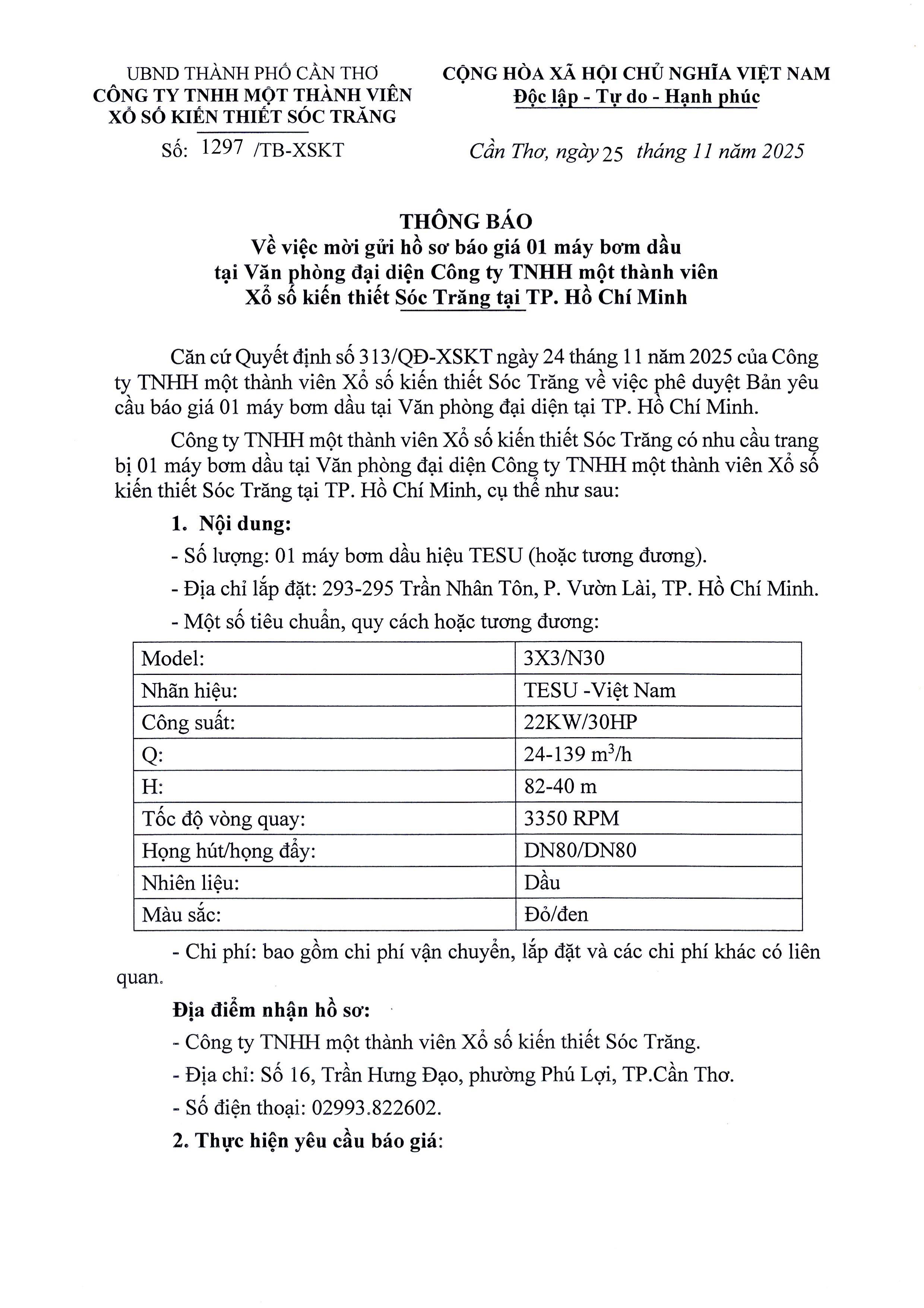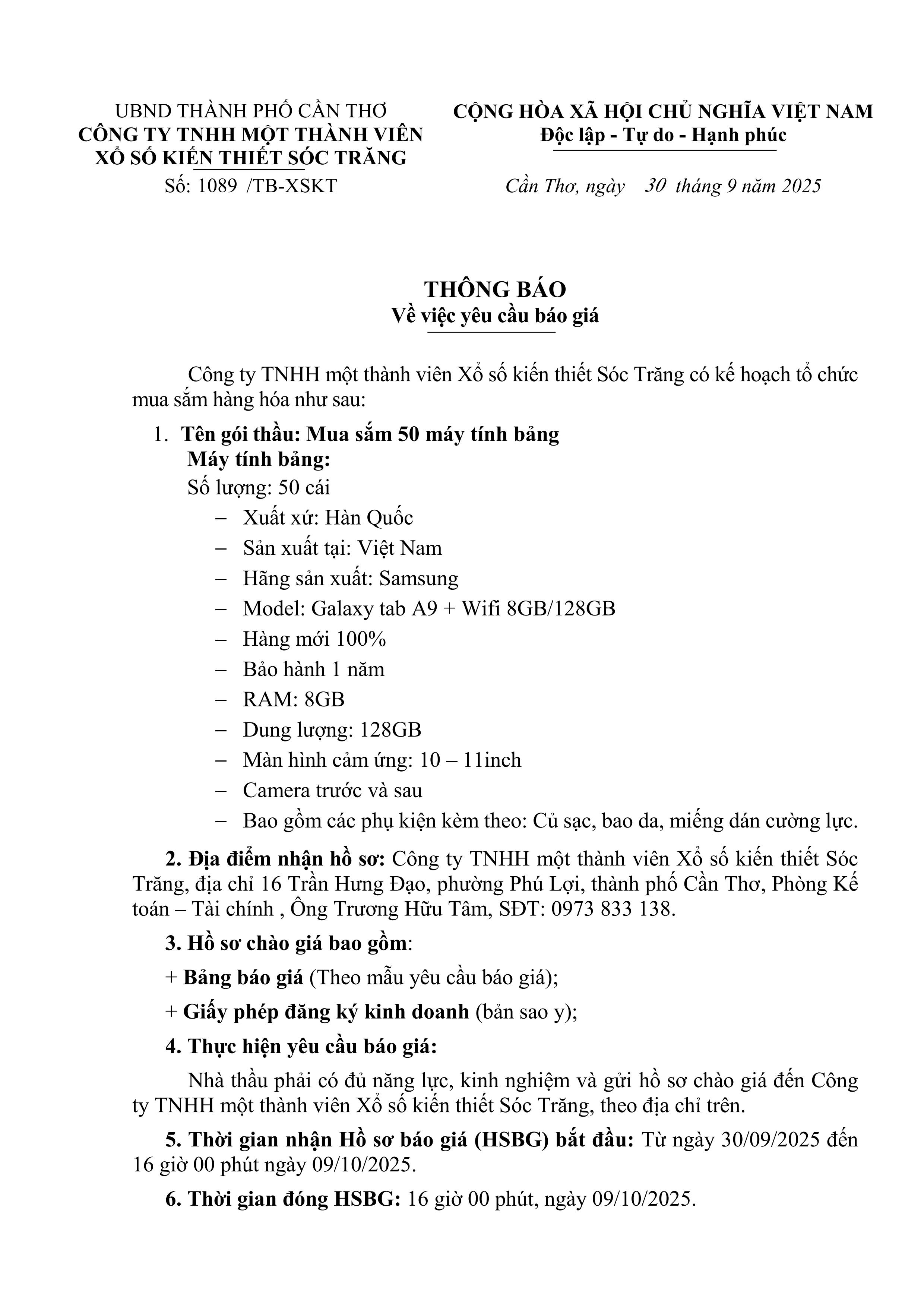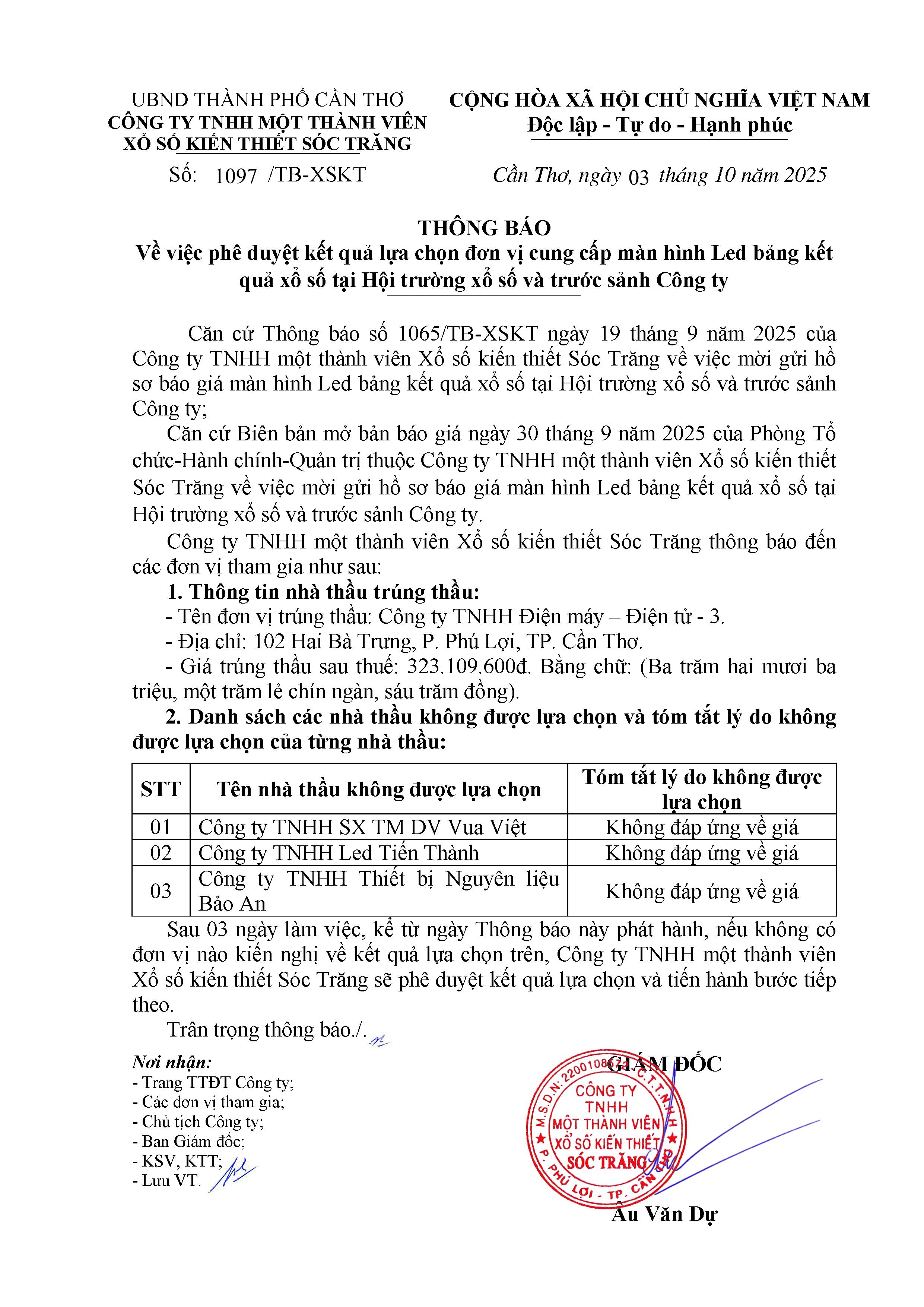 * * Vé số Sóc Trăng quay số mở thưởng vào lúc 16 giờ 15 phút ngày thứ Tư hàng tuần, tại số 16 Trần Hưng Đạo, phường Phú Lợi, thành phố Cần Thơ. Kết quả xổ số kiến thiết Sóc Trăng được truyền hình trực tiếp trên kênh truyền hình Thành phố Cần Thơ 3, phát thanh trực tiếp trên sóng FM tần số 100.4 Mhz Phát thanh Thành phố Cần Thơ và trên sóng AM tần số 610 Khz Đài tiếng nói Nhân dân Thành phố Hồ Chí Minh.