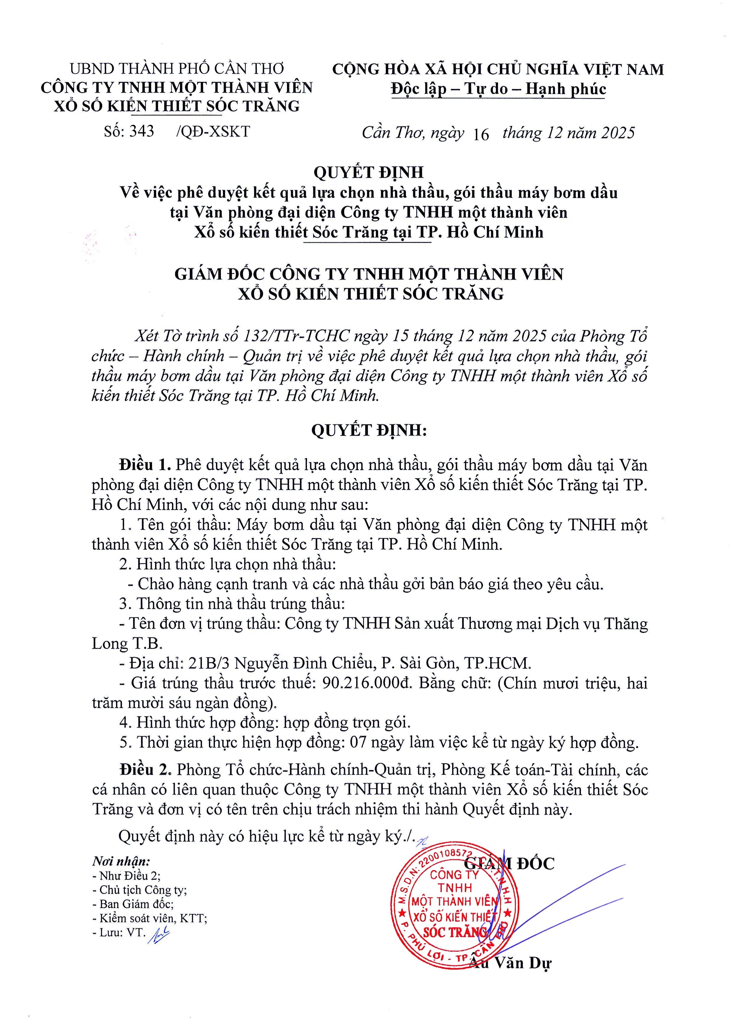 Quyết định về việc phê duyệt kết quả lựa chọn nhà thầu, gói thầu máy bơm dầu tại VPĐD Công ty TNHH MTV Xổ số kiến thiết Sóc Trăng tại TP. HCM