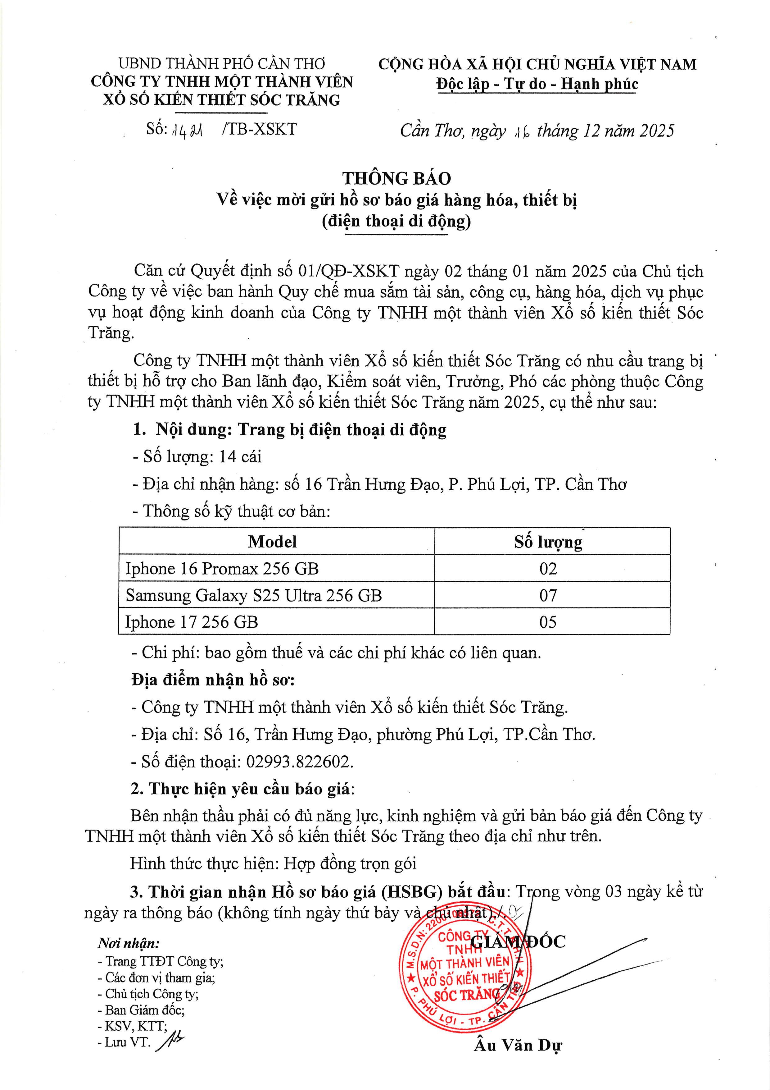 Thông báo về việc mời gửi hồ sơ báo giá hàng hóa, thiết bị (điện thoại di động)