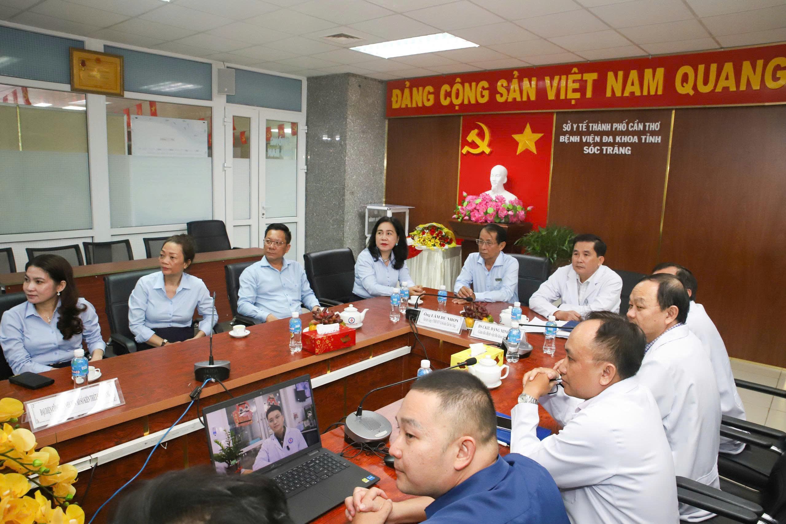 Lãnh đạo Công ty TNHH MTV Xổ số kiến thiết Sóc Trăng và Ban Giám đốc Bệnh viện Đa khoa tỉnh Sóc Trăng cùng xem clip giới thiệu, đánh giá hiệu quả hoạt động của các thiết bị do Công ty tài trợ.